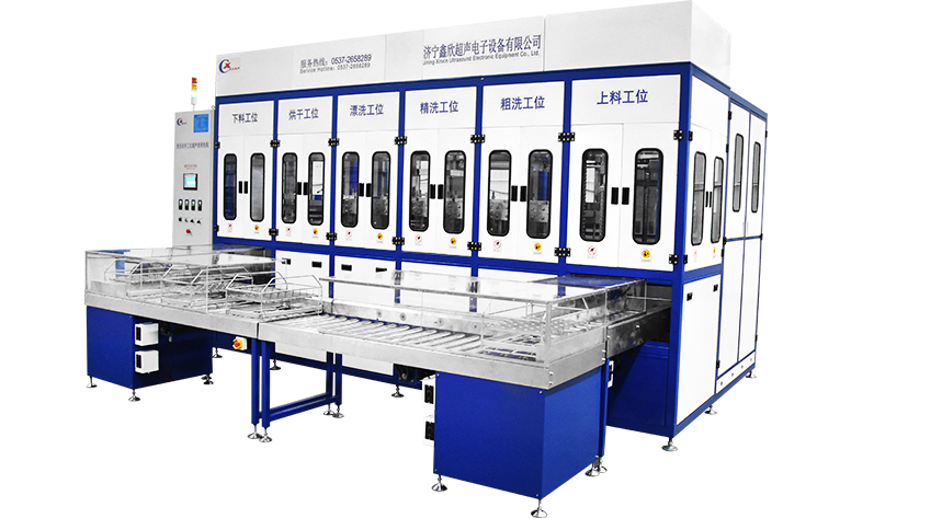 該設(shè)備有上下料網(wǎng)帶、超聲波清洗工位、噴淋漂洗工位、高壓風(fēng)切、熱風(fēng)烘干工位、溫控水加熱系統(tǒng)、風(fēng)機、溫控空氣加熱系統(tǒng)、移動式風(fēng)刀、PLC+觸摸屏控制系統(tǒng)、管路系統(tǒng)及智能電器控制系統(tǒng)等組成。自動進排液和自動
